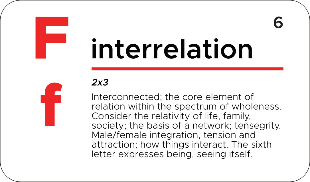 The core meaning the letter F points us to is to consider the relationality of all things. It progresses us down a pathway of discovery, an emergent development, in a natural order. With F, we are encouraged to consider the interconnectedness of life, and the foundational aspect of relationship within the spectrum of wholeness.