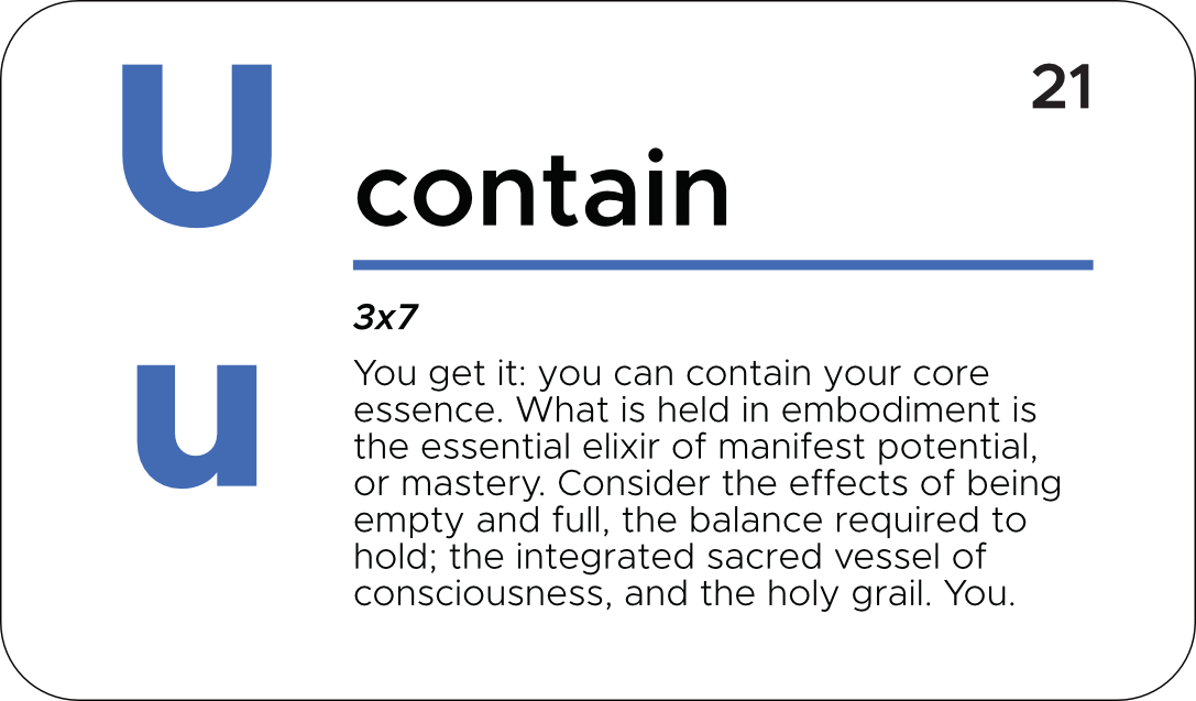 U is the twenty-first letter of the alphabet and is the completion of the identity of the third tier. I am connected, present, and able to contain all that I am. This, knowing all that I’ve learned and integrated in the first two tiers: I am all that is, being, seeing, form, energy, in relationship, essential, eternal and complete; I am a creator, choosing, informing, in time, inside me, in the world, thinking, questioning and activating; I am connected, present and can contain all that I am.