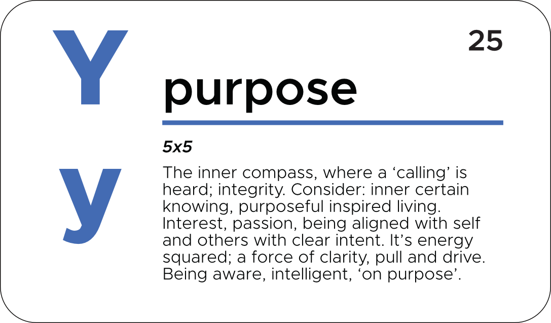 Meanings: Higher purpose, inner knowing, clarity and drive, the why; purpose; energy squared, self referenced alignment, integrous reason, certainty, inner knowing, expressed clarity of intent, drive