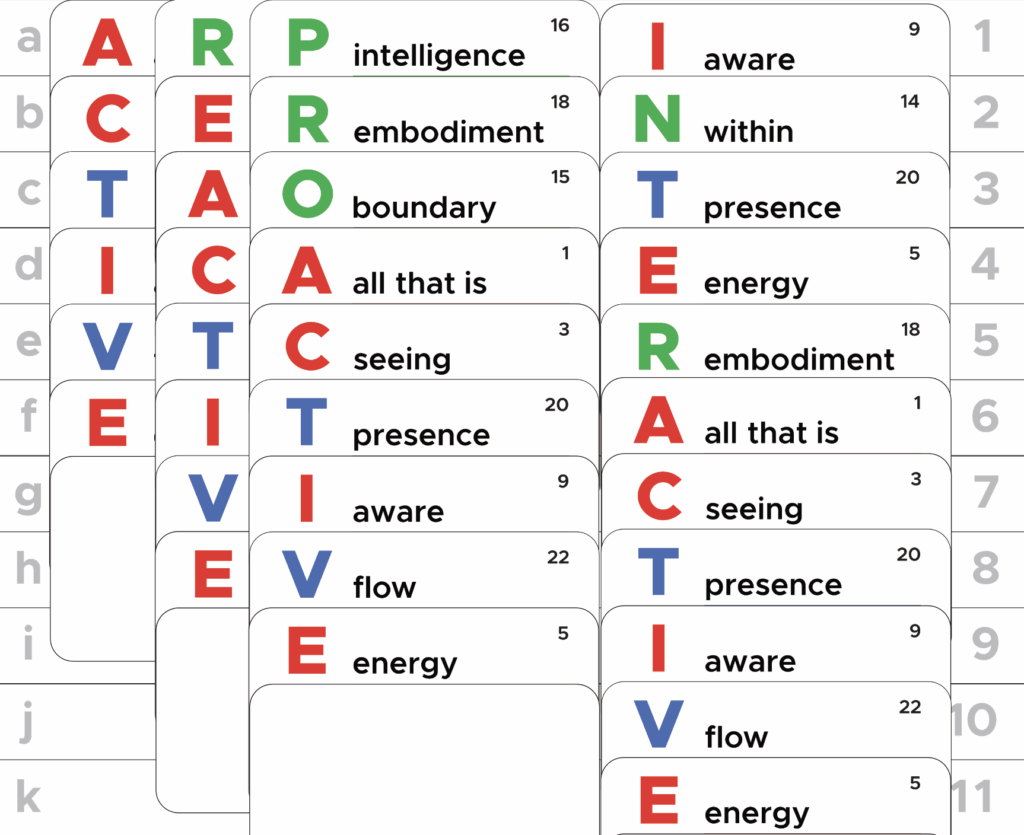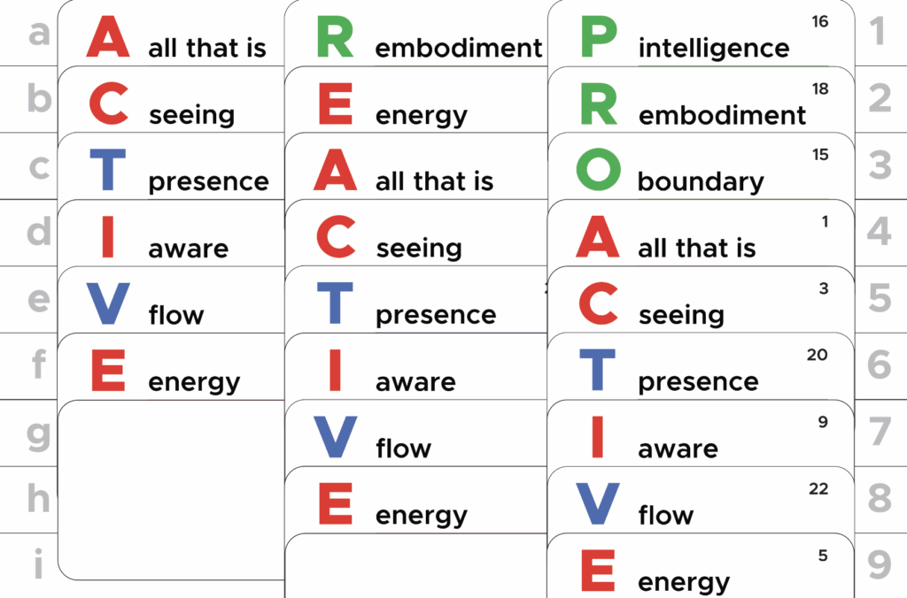 PROACTIVE is even more loaded with capacities: PRO is all second tier energy. All about (P) intelligence, being (R) embodied and form a perspective that is (O) bounded. ACTIVE now starts at the fourth position (D), form, the natural laws expressed. The (P) intelligent (E) energy hinges around (C) in the place of energy. So an energetic intelligent seeing. Way different from REACTIVE. More freedom of perspectives, I would say.
